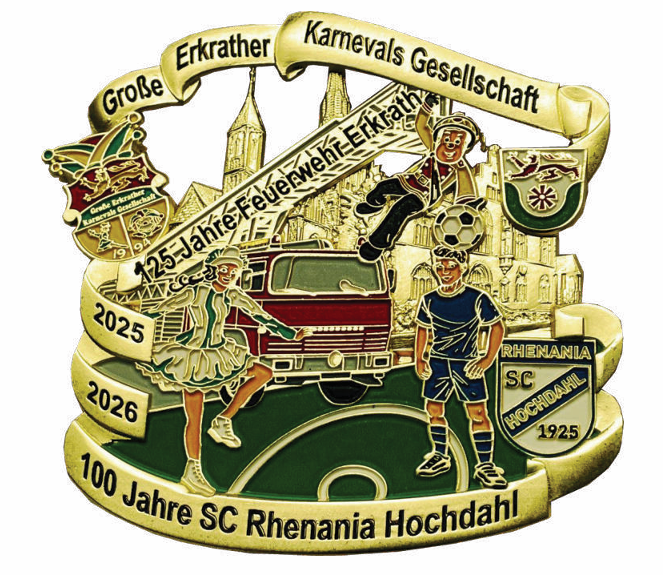 Ein besonderes Highlight jeder Session ist der Sessionsorden. In diesem Jahr trägt er zwei besondere Motive: 125 Jahre Freiwillige Feuerwehr Erkrath und 100 Jahre Rhenania Hochdahl. Mit ihm wollen wir das Engagement dieser wichtigen Einrichtungen würdigen und gleichzeitig Tradition, Karneval und Gemeinschaft verbinden.
