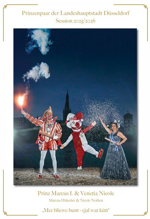 Das Düsseldorfer Prinzenpaar Marcus Hülscher und Venetia Nicole Nothen führt die Landeshauptstadt in dieser Session mit Herz, Tradition und viel Freude an. Unter ihrem Motto: